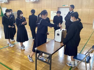 全ての演説を聴いた後、本物の記載台と投票箱を使って、投票を行いました。「どうやって用紙を折るの?」『どっち向きで入れるの?」と近くにいる先生に聞きながら、ちょっと緊張感をもって投票しているようでした。この生徒会選挙を通して、来年度も森田中学校がさらにステップアップしていくことを期待してやみません。