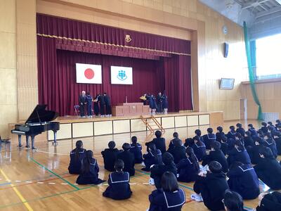 定期異動により、4人の先生が学校を去られます。とてもさみしい気持ちです。でも、先生方と過ごした日々、ともに学んだことは、ずっと心に残り、ここにいる私たちを励まし勇気づけてくれるでしょう。森田中学校のため、生徒のため、地域、保護者の方のため、私たち教職員のために力をくださり、ありがとうございました。どうぞお元気で。