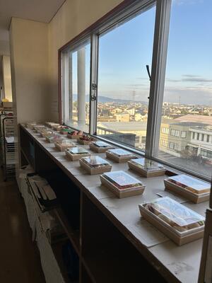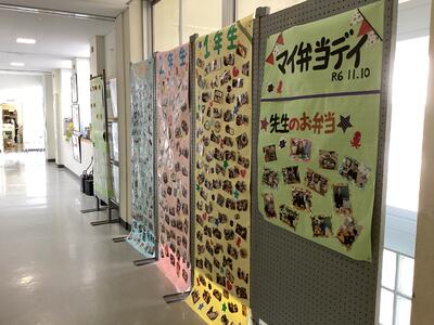 11月10日(日)のマイ弁当デイの昼食の様子の写真を展示しています。PTA家庭教育委員会の保護者の方が作成してくださいました。お弁当を作った気持ちを詠んだ川柳の優秀作品も掲示しています。とっても素敵です。
