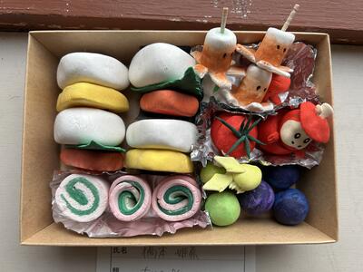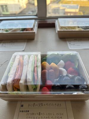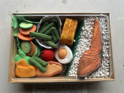 次は、美術。美術室前の廊下には、小中学生美術作品展に出品された紙粘土作品の、お弁当が展示されています。