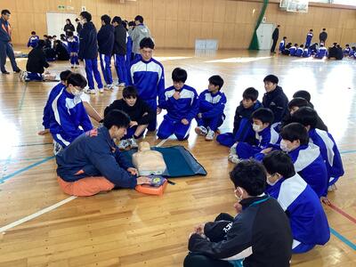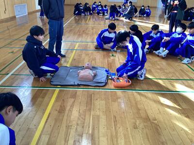生徒は、倒れている人を発見したときの行動の取り方、胸部圧迫の仕方、AEDの使い方を学び、実際に体験しました。