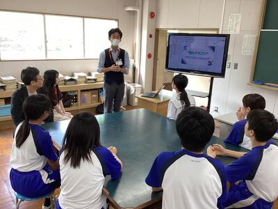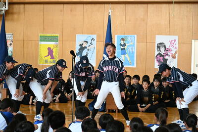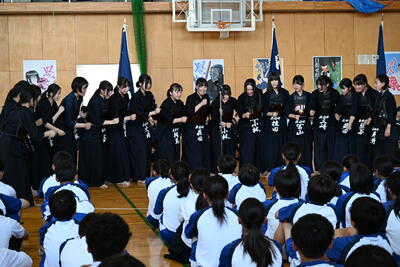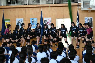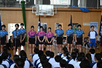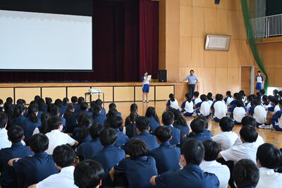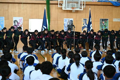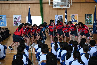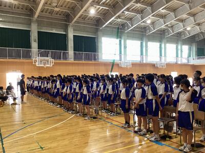 両校の校長先生同士が知り合いということから実現した訪問で、3年生と一緒に、体育館で交流会を行いました。