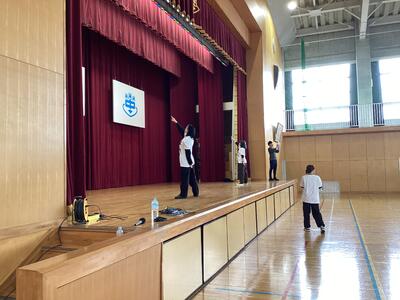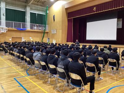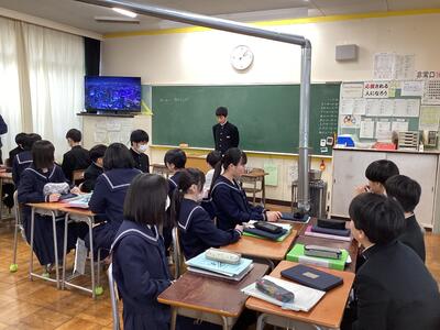前半のテーマは総合的な学習の時間に学んだことと、後半のテーマは自分たちで作った校則は守れているかについてです。司会は2年生が務めました。