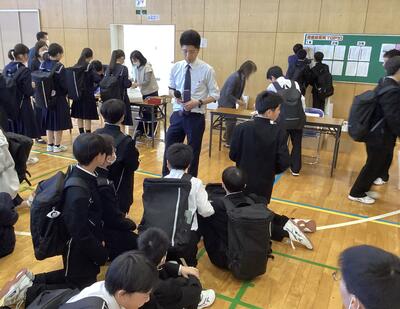 3年生は、修学旅行直前の諸注意を確認することと、福井駅での新幹線の乗り方を確認しました。大人数でも、短い乗車時間でスムーズに乗れるように、席や並び方を確認し、乗り方をシミュレーションしました。