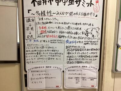 また、年末に生徒会の生徒が参加した、福井市中学生サミットで学んだこと、考えたことをホワイトボードにまとめて、全校に発信しています。