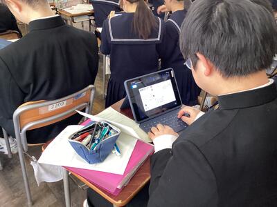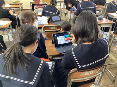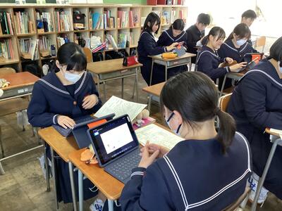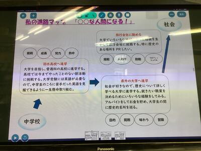 今日は、タブレットで進路マップづくりをしていました。事前に行った進路調べでは、自分が大切にしたい価値観を明らかにしながら、就きたい職業とそれを実現させるための高校選択についてワークシートにまとめました。それを基にした進路マップです。これを機会に、自分の夢や将来について真剣に考え、なりたい自分になるために目標をしっかり考えることを期待します。