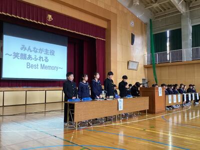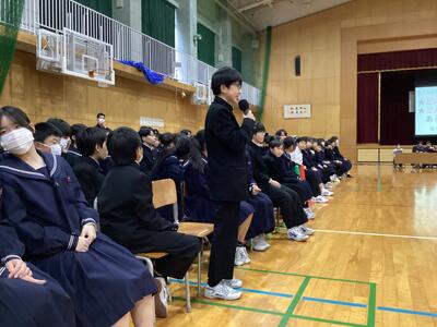 生徒総会の前半には、生徒会役員と各委員長が後期のスローガン、活動計画の報告を行いました。森田中最後の締めくくりとして、どの委員会でも学校を良くするために全力で取り組んでいってください!