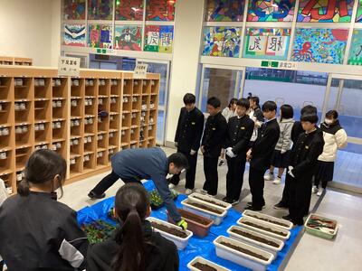 11月21日(金)の放課後、生徒会執行部と2年生の生活委員で、生徒玄関の花植を行いました。プランターにどんな配置で植えればキレイか、相談しながら楽しく活動できました。学校にお越しの際はぜひ注目してみてください!